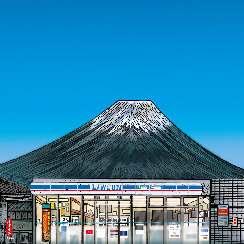 "Blue Sky at Fujikawaguchiko", illustration dessinée à la main et colorisée numériquement.