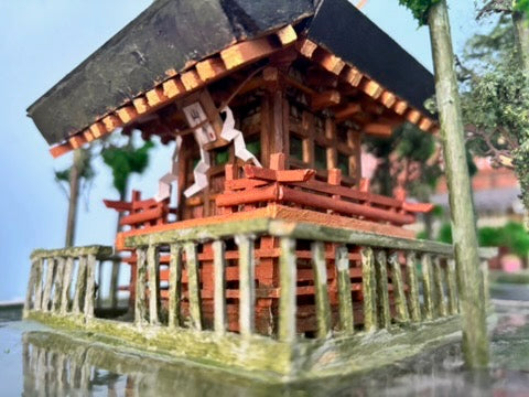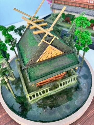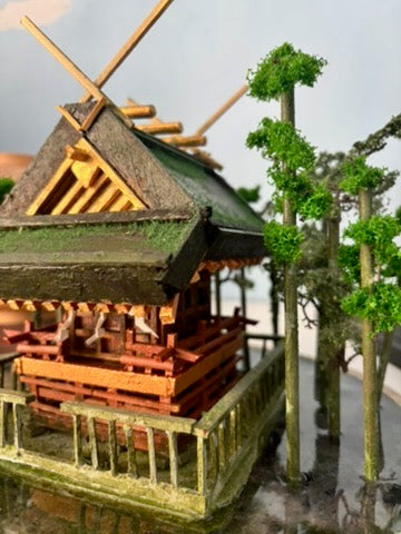 Cette œuvre miniature représente un petit temple shintô abandonné au milieu d’un petit lac entouré d’arbres, dans une atmosphère typique « Wabi-sabi ».