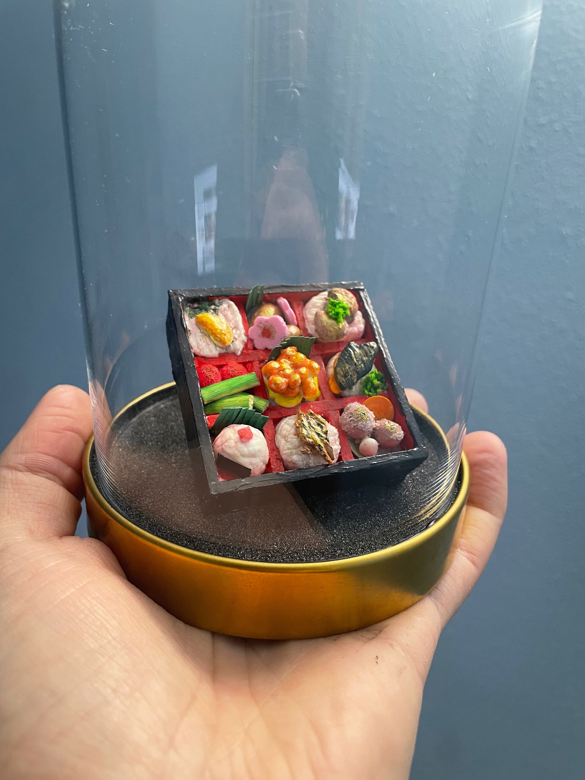 Cette œuvre est réalisée en pâte de modelage avec de la peinture acrylique. Le plateau du bento est en bois peint en noir vernis monté sur un socle de 10 cm de diamètre.