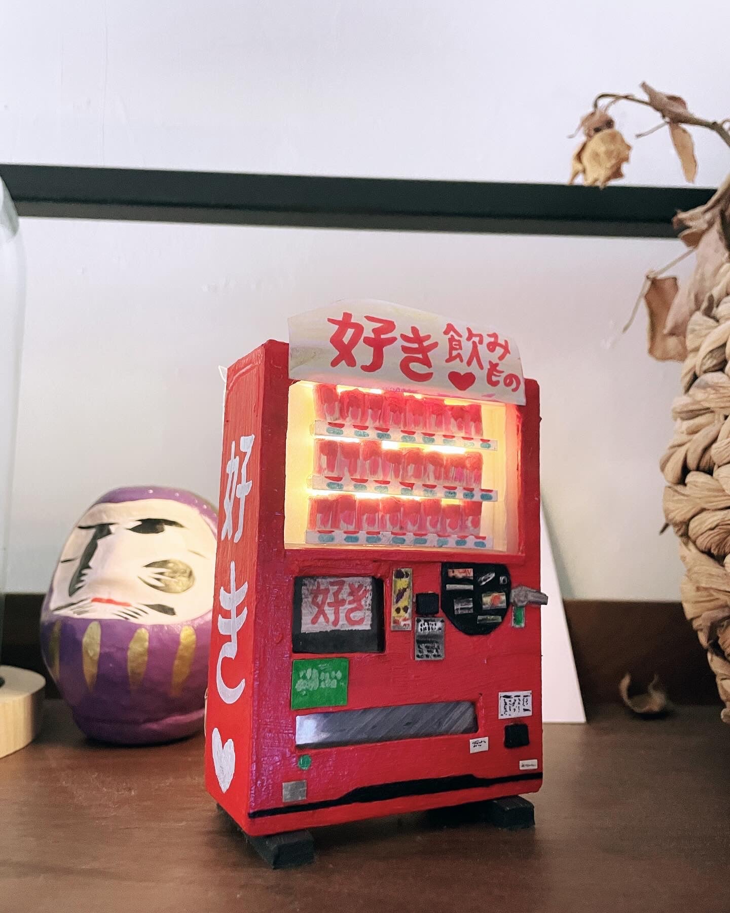 Cette création artistique est un hommage aux distributeurs automatiques japonais que l’on appelle « Jidouhanbaiki ». Très populaires au Japon, ces machines sont présentes partout sur le territoire du pays, à chaque coin de rue jusque dans les régions les plus isolées. « Love Vending Machine » est réalisé en bois, carton, plastique recyclé, peinture acrylique et mousse naturelle. La cloche et la lumière led avec piles sont incluses.